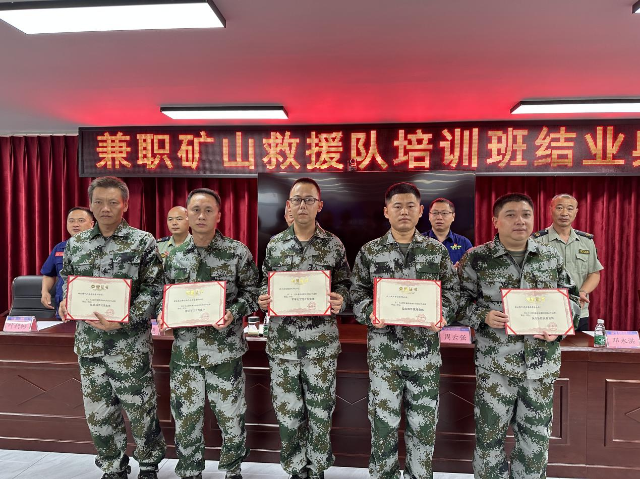 此次培训,严格按照军事化管理标准,培训人员通过军事体能、教学课程、专业实操、配机训练等内容考核,从矿山救援队伍组织管理、救援装备与设施、救援一般规定、救援方法和行动准则、现场急救、预防性安全检查和安全技术工作等方面进行全面、专业的培训。梭罗沟金矿全体参训人员在本次培训队伍中表现突出,全部培训合格,培训学员吴世明获得“先进个人”的荣誉称号,梭罗沟金矿参加培训的团队荣获“军事化管理优秀集体”团体荣誉,受到表彰。